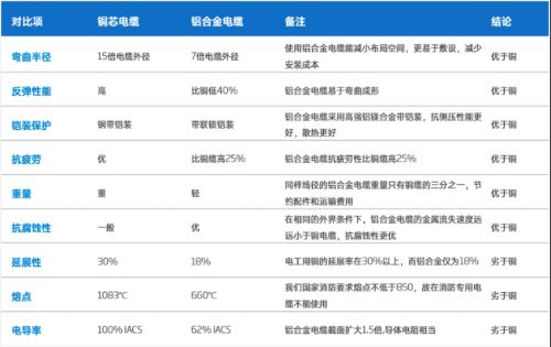 相较于常规铝芯线缆成本低、重量轻,铜芯线缆载流量、电阻率、强度等性能上更加优异;随着技术引进和配套连接端子,桥架以及对应标准的建立,性能介于铝铜线缆之间的铝合金线缆,逐渐进入市场。