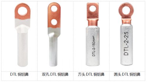 目前市场上有三种端子适合于铝合金线缆,包括铜端子,铜铝过渡端子和铝合金铜过渡端子,常见的铜铝转接端子如下图所示: